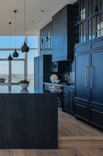 The natural greenery on the yellow and mustard cabinet countertop and the chimneys colour brings life to this dark moody interior.
